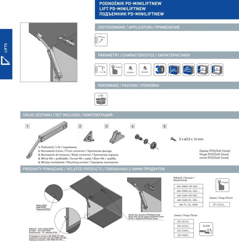 Podnośnik MINILIFTNEW Medium, bez spowalniacza, do frontów 3,5-4 kg, chrom