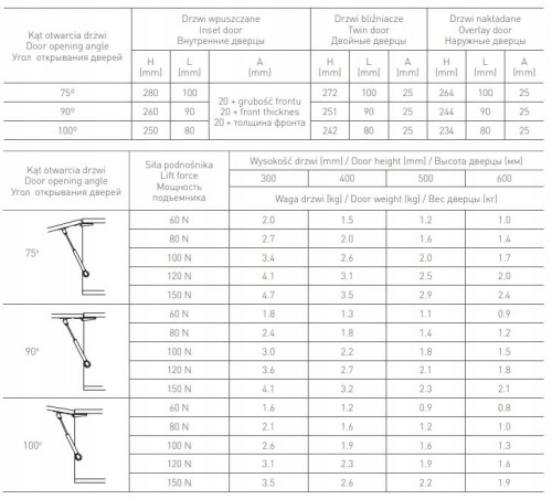 Obciążenie: Aby front nie odkształcał się w trakcie użytkowania zamykał i otwierał płynie należy odpowiednio dobrać moc o do ciężaru frontu, na każdy kilogram ciężaru frontu przypada w przybliżeniu siła rozprężania równa ok. 10N aby dokładnie dobrać siłownik zapraszamy na stronę: Kalkulator podnośników - GTV